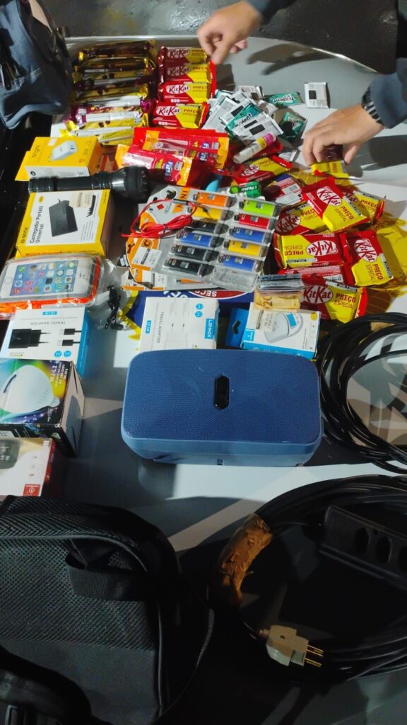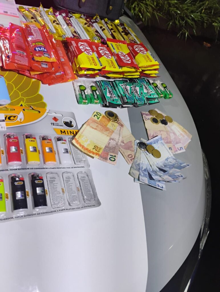Com o indivíduo, os agentes encontraram grande quantidade de mercadorias subtraídas do estabelecimento. Entre os itens recuperados estavam chocolates, balas, chicletes, mochilas, caixas de som, extensões, lanternas, carregadores, fones de ouvido, isqueiros, uma lâmpada com som e um celular Samsung Galaxy A05. O responsável pela loja, informou que o prejuízo estimado é de cerca de dois mil e quinhentos reais. Também havia dinheiro em espécie entre os itens recuperados.